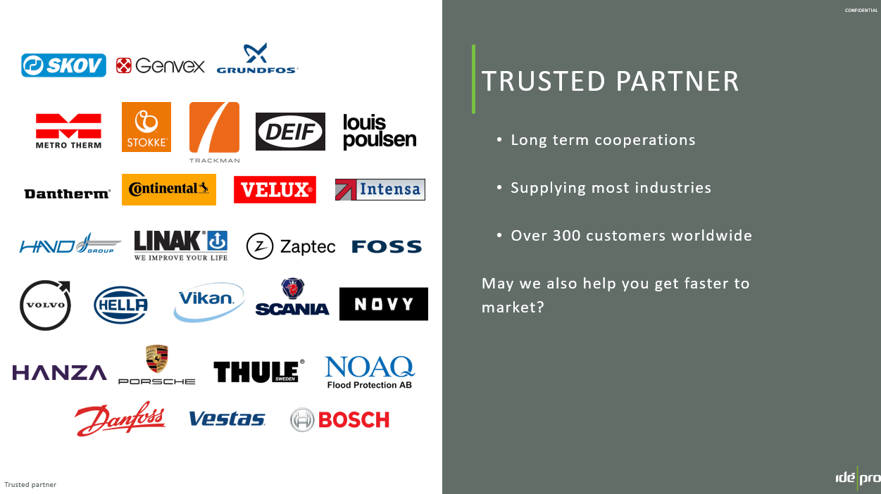 Idag har Idé-Pro ca 300 kompetenta och engagerade medarbetare på två platser i Danmark, Skive och Glyngøre, med produktion och administration, ett försäljningskontor i Göteborg samt ett dotterbolag i Bangalore, Indien.