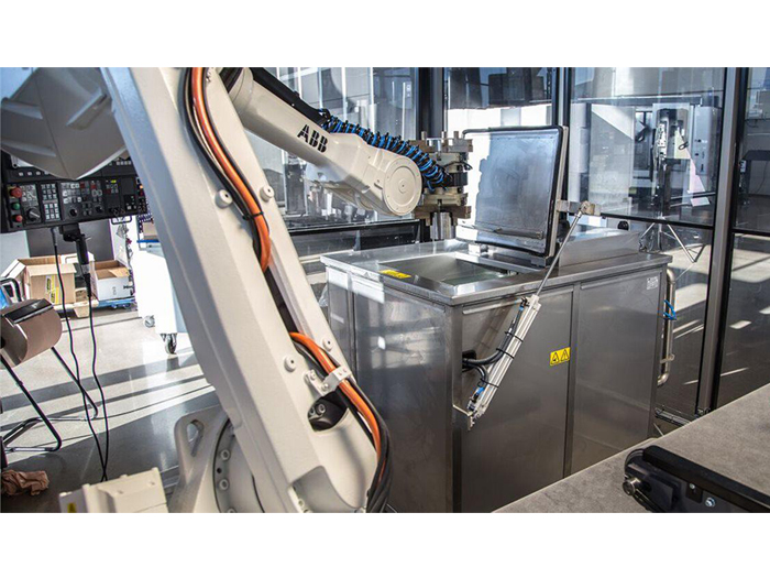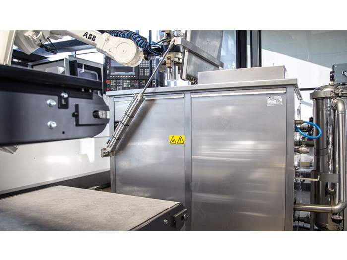En tvättlösning som är integrerad med ett robotinterface. I en robotcell styr roboten helt processen, efter bearbetningsmaskin så öppnar den luckan på tvätten och kan antingen lämna eller hålla detaljen under tvättprocessen. Med värme, ultraljud och jacuzzispolning så blir detaljen ren inför vidare bearbetning eller transport.