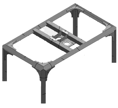 Komponentens huvudstruktur består av flera delar som är sammanfogade genom svetsning. Det finns specifika instruktioner för att slipa svetsarna och säkerställa att de är plana och estetiskt tilltalande.