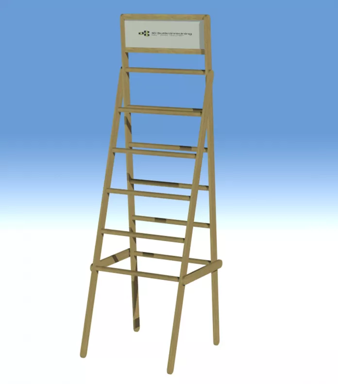 En stege med rundstav och ben. Rundstav med diameter 30 mm. Ben med dimensionerna 50x15 mm.