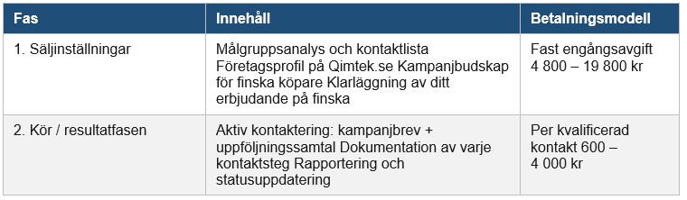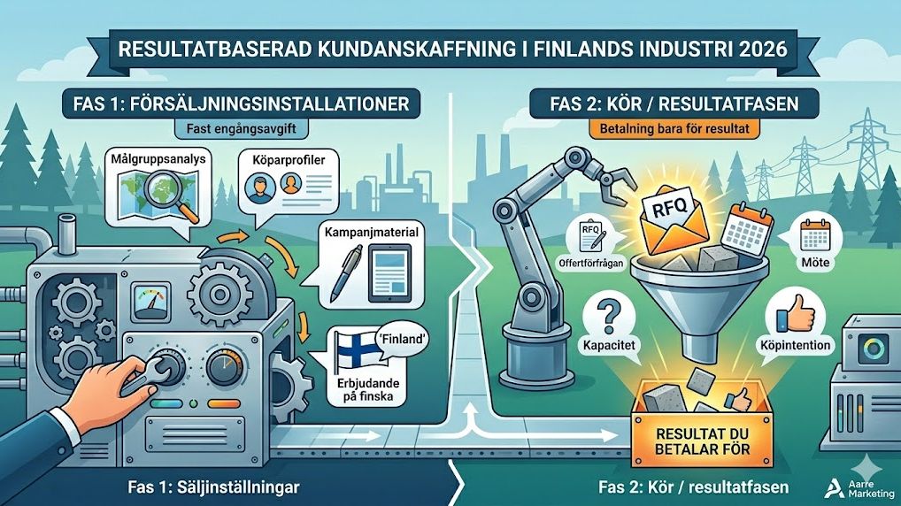 Den finska industrimarknaden rör sig igen. Men att ta sig in på en ny marknad kostar normalt sett både tid och pengar, utan garanti för att kontakterna du betalar för leder någonstans. Det finns ett bättre sätt. En fast engångskostnad täcker förarbetet: målgruppsanalys, köparprofiler och kampanjmaterial. Därefter betalar du bara när det händer något konkret. En offertförfrågan. Ett möte. En kapacitetsfråga med tydlig köpintention.